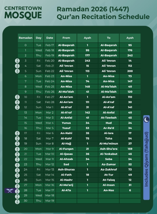 Follow along during Ramadan as we complete the Quran throughout Isha, Taraweeh and Tahajjud. Khatam al Quran (Quran completion) on Tuesday March 17 (Night #29) inshaAllah
