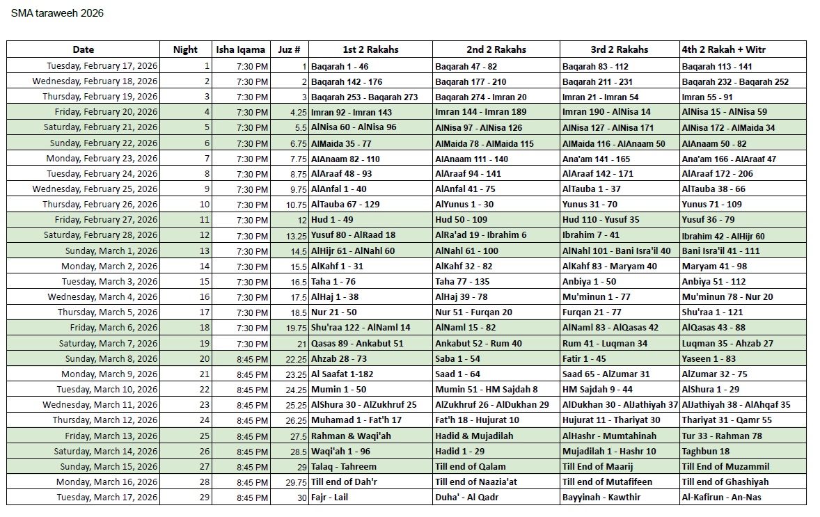 Salaam Dear Stittsville Community - Taraweeh at SMA will be starting tomorrow evening Insha'Allah (subject to Ottawa Gatineau Imam Council Ramadan announcement) following Isha at 7:30pm. We will complete the full Quran recitation during Ramadan in 8 rakats Insha'Allah.
