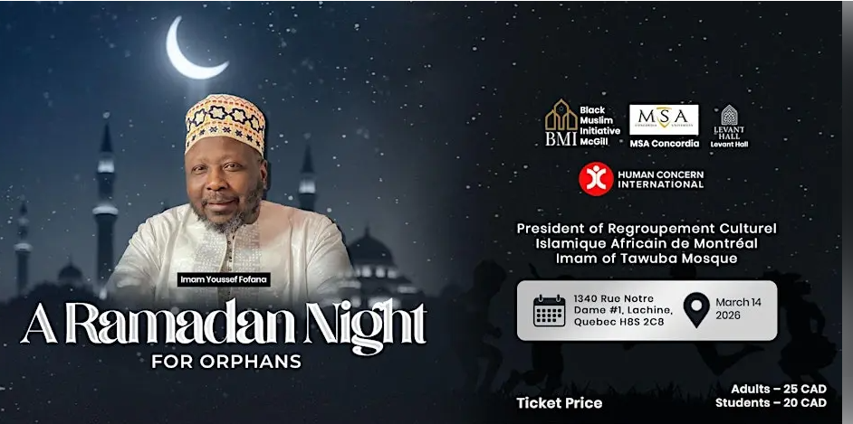 This meaningful evening will bring our community together in the spirit of Ramadan — a month of compassion, generosity, and solidarity. The distinguished guest speaker of the evening will be Imam Youssef Fofana, President of Regroupement Culturel Islamique Africain de Montréal and Imam of Tawuba Mosque. He will deliver a special talk focused on the importance of caring for orphans in Islam and our collective responsibility toward vulnerable communities.