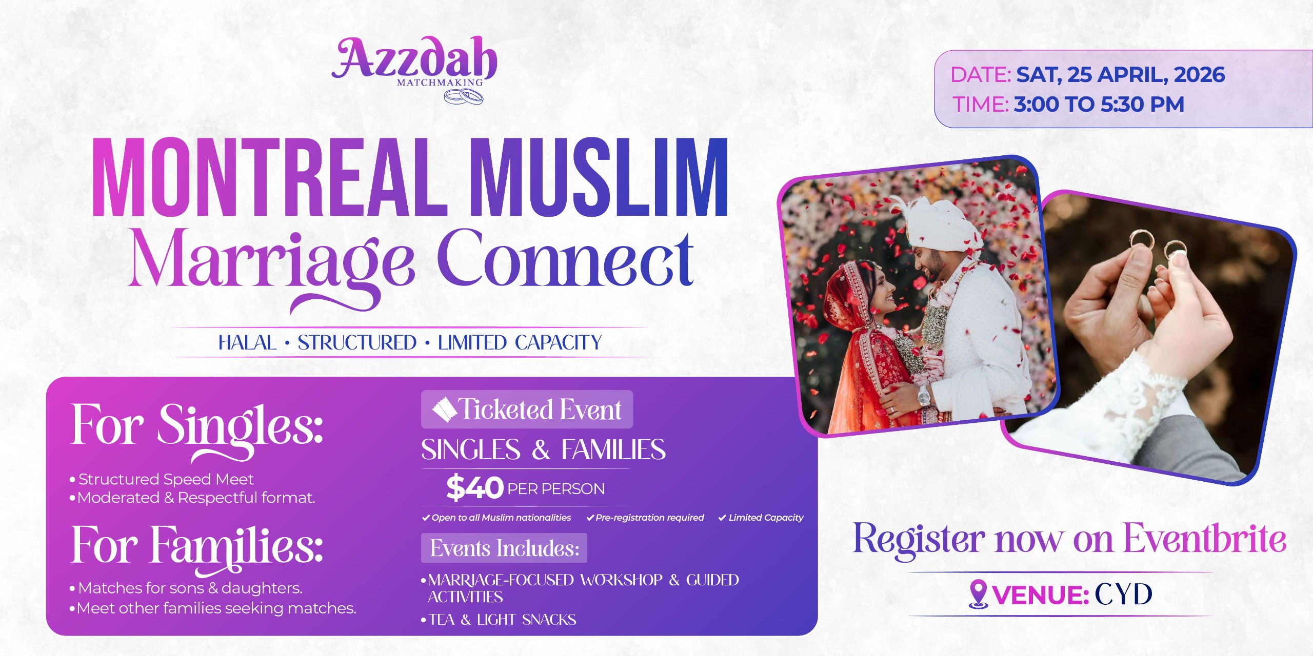 Montreal Muslim Marriage Connect is a thoughtfully curated matchmaking experience created to serve two separate groups, each with a clear purpose and structured format.