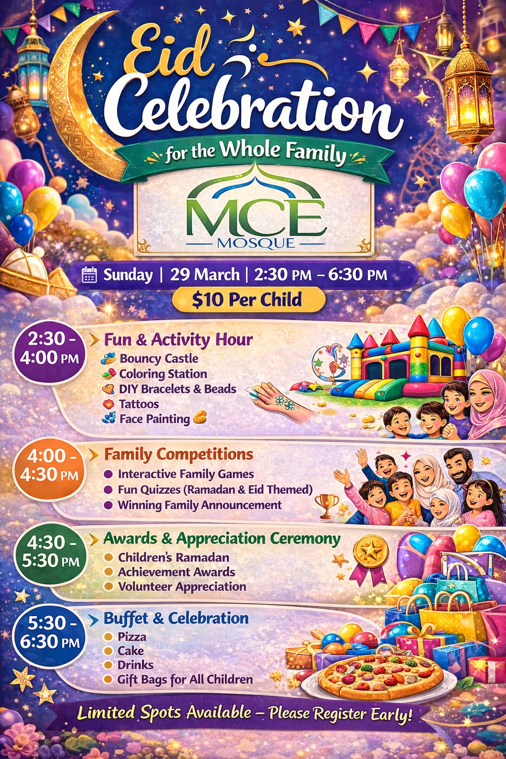 Join us at MCE (Mosque Community of Edmonton) for a joyful Eid Celebration honoring our children’s Ramadan achievements