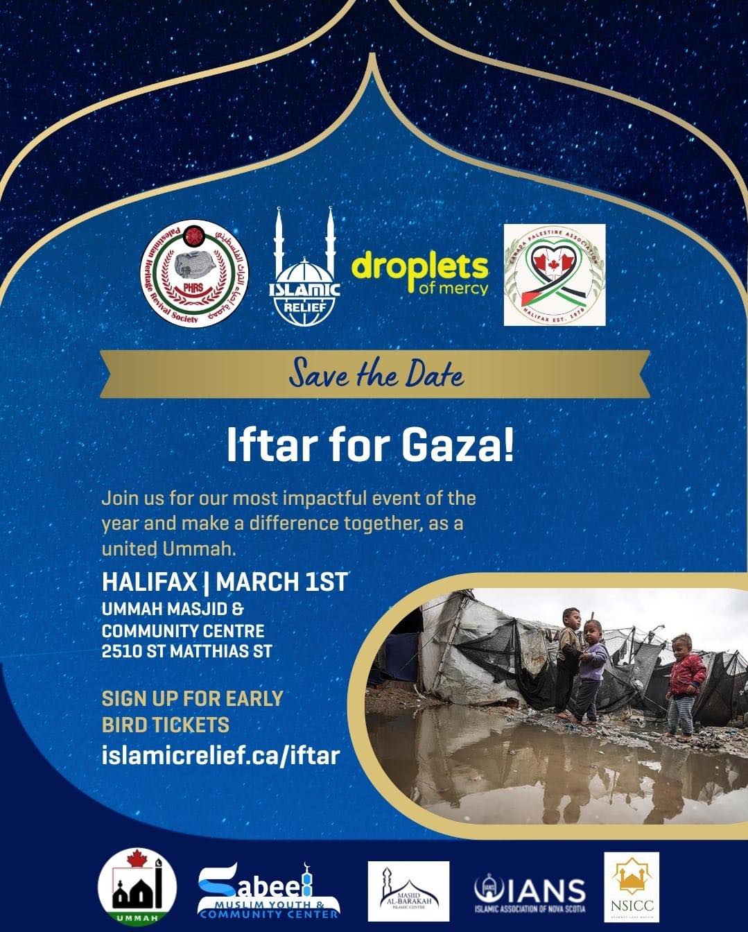 This event is held in support of humanitarian relief efforts for Palestine through Islamic Relief Canada, providing urgent aid, food assistance, medical support, and life-saving relief to families affected by ongoing crises. By attending, you are not only nourishing your soul and strengthening community ties, but also extending the mercy and blessings of Ramadan to those facing hardship and injustice.