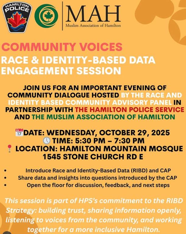 The Hamilton Police Service and the Muslim Association of Hamilton invite you to share your voice, learn, and engage in an open discussion on race and identity-based data.