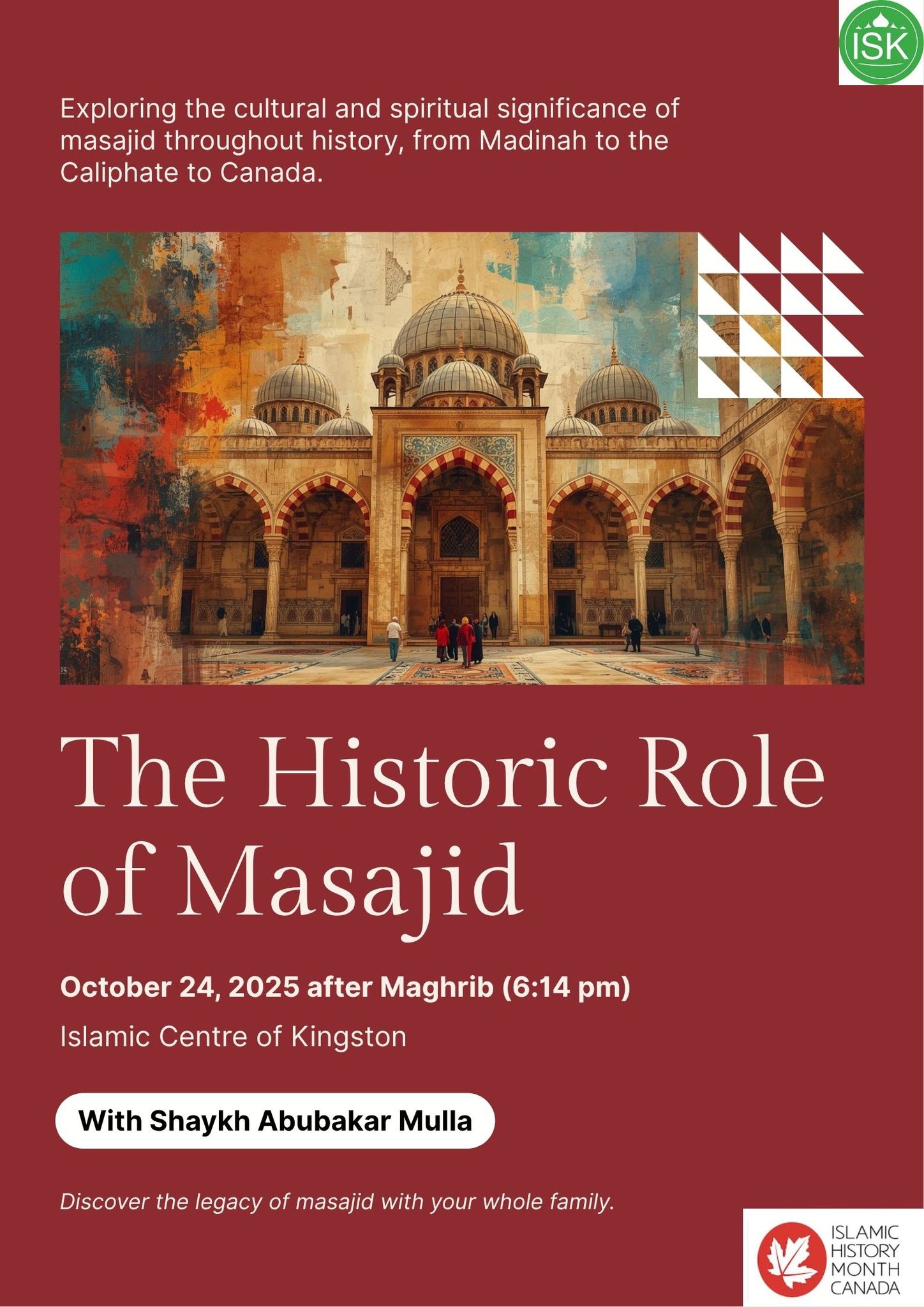 Discover the legacy of masajid with your whole family at the Islamic Centre of Kingston on Friday, October 24 starting after Maghrib Insha Allah