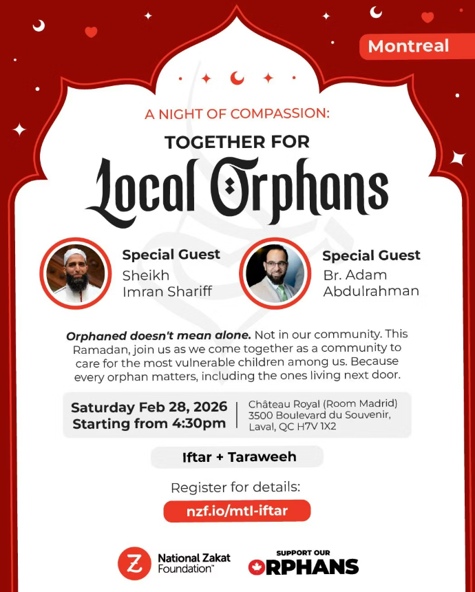 Join us this Ramadan for a community iftar as neighbours and friends gather to raise funds for orphaned children here in Canada. Together, we will share a meal, strengthen our bonds, and turn compassion into meaningful support for children who deserve care, stability, and hope.