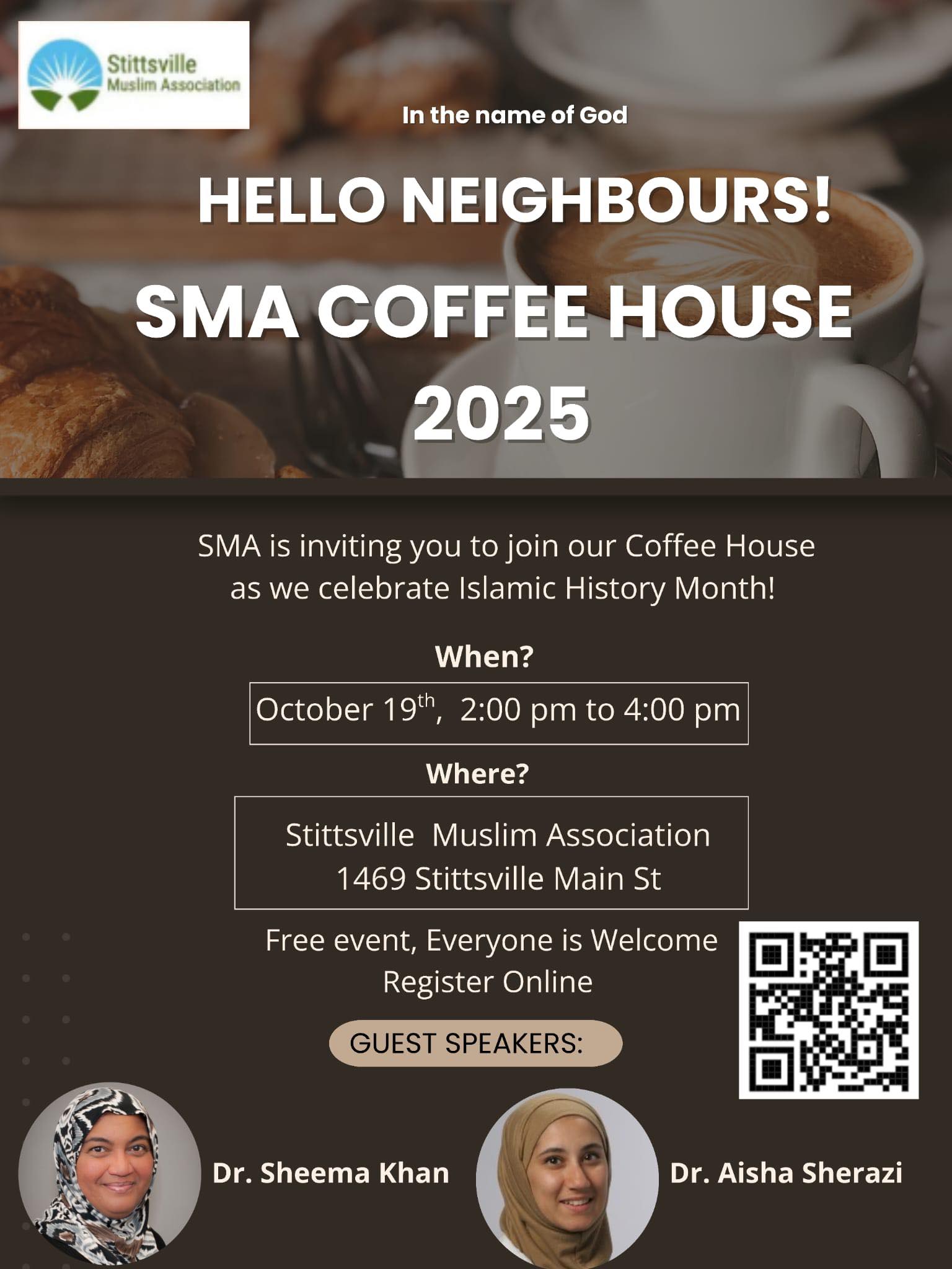 October is Islamic History Month, and we are looking forward to welcoming our neighbours in our new location to join us for coffee, light refreshments, and a meet and greet with a small presentation. The event is free, registration is required for each attending person or each household.