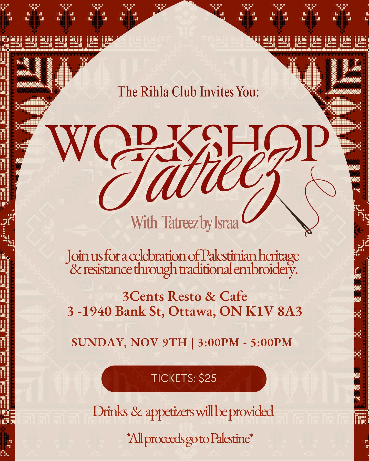 Join The Rihla Club’s Tatreez Workshop for a hands-on celebration of Palestinian heritage through the timeless art of embroidery, led by the talented Tatreez by Israa