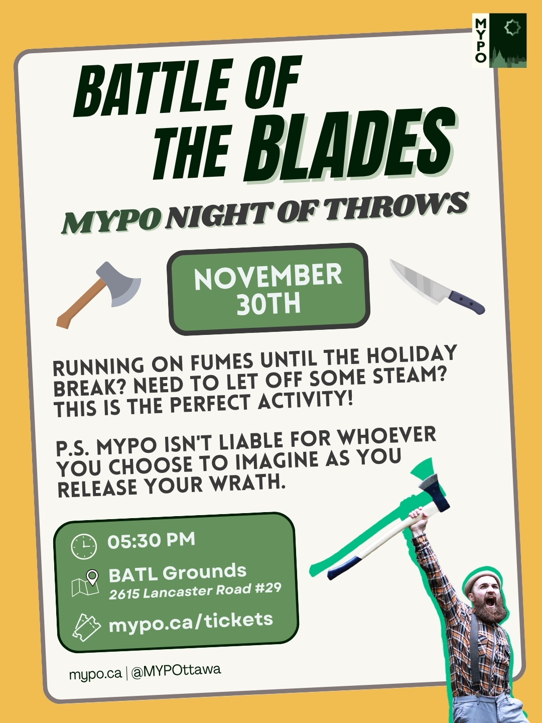 Join MYPO as we throw axes and knives and spread warmth through the West Ottawa Interfaith Bridge Winter Clothing Drive