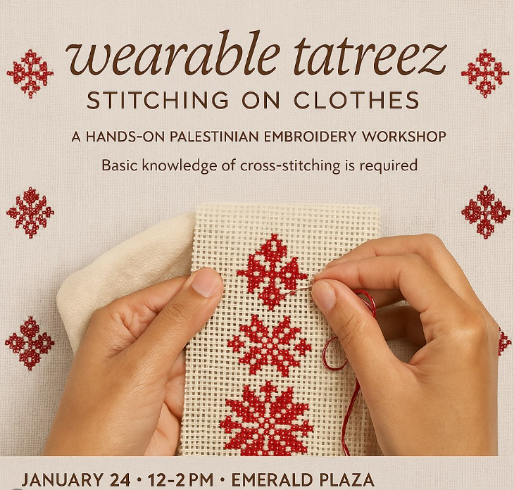 Join us for a cozy, creative session where you’ll learn how to stitch traditional Palestinian tatreez directly onto your own clothing using waste canvas.