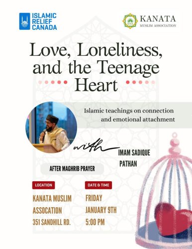 Join our community this Friday, January 9th at 5:00 PM (after Maghrib) at the Kanata Muslim Association, 351 Sandhill Rd., for an important youth-focused talk: “Love, Loneliness, and the Teenage Heart.”
