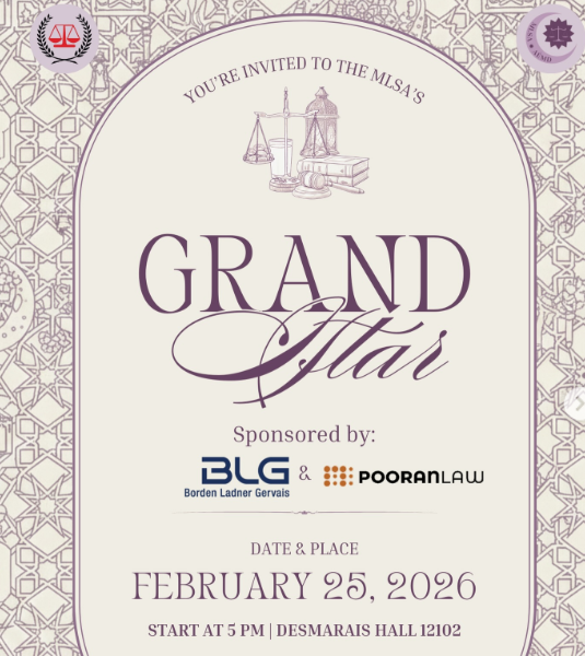The Muslim Law Students’ Association (MLSA) at uOttawa invites you to our Annual Grand Iftar, sponsored by BLG LLP and PooranLaw LLP, on Wednesday, February 25, 2026, at 5 p.m. at 12102 Desmarais Building (55 Laurier Ave E, Ottawa ON, K1N 9B9).