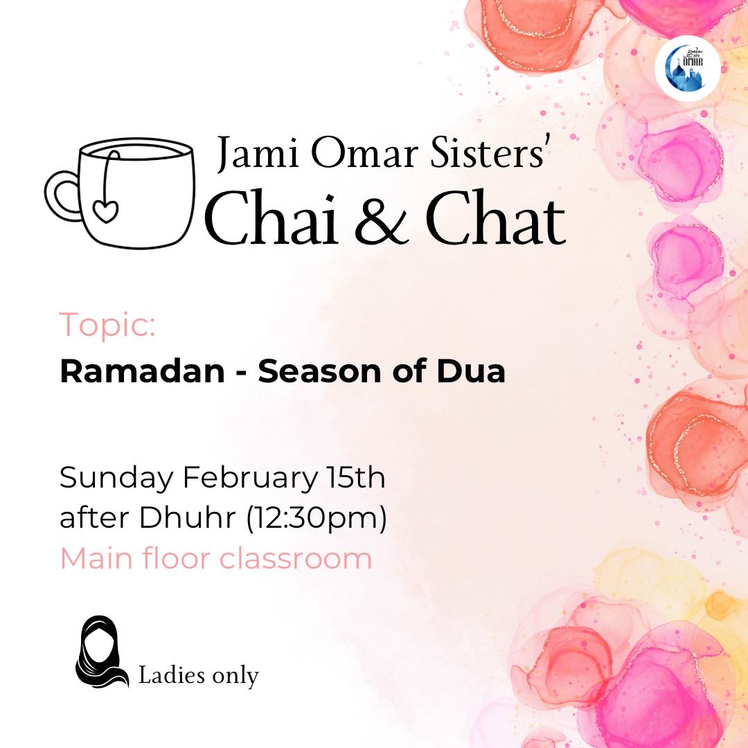 Join us for Sisters' Chai & Chat session. Meet new sisters and talk about topics that matter to our community!