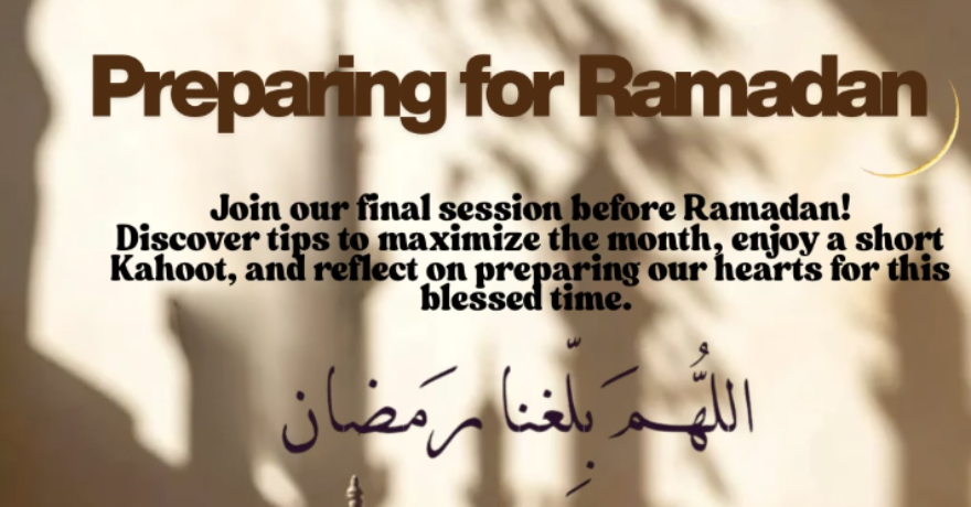 Join us for our last session before Ramadan, we’ll share practical tips to help you make the most of the month, play a short Kahoot, and take time to reflect on preparing our hearts for this blessed season