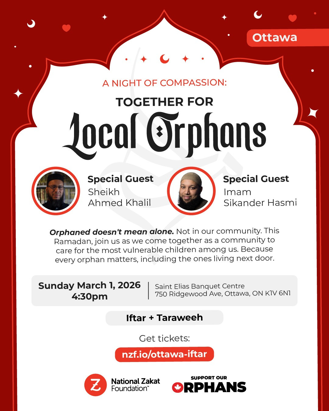 Join us this Ramadan for a community iftar as neighbours and friends gather to raise funds for orphaned children here in Canada. Together, we will share a meal, strengthen our bonds, and turn compassion into meaningful support for children who deserve care, stability, and hope.