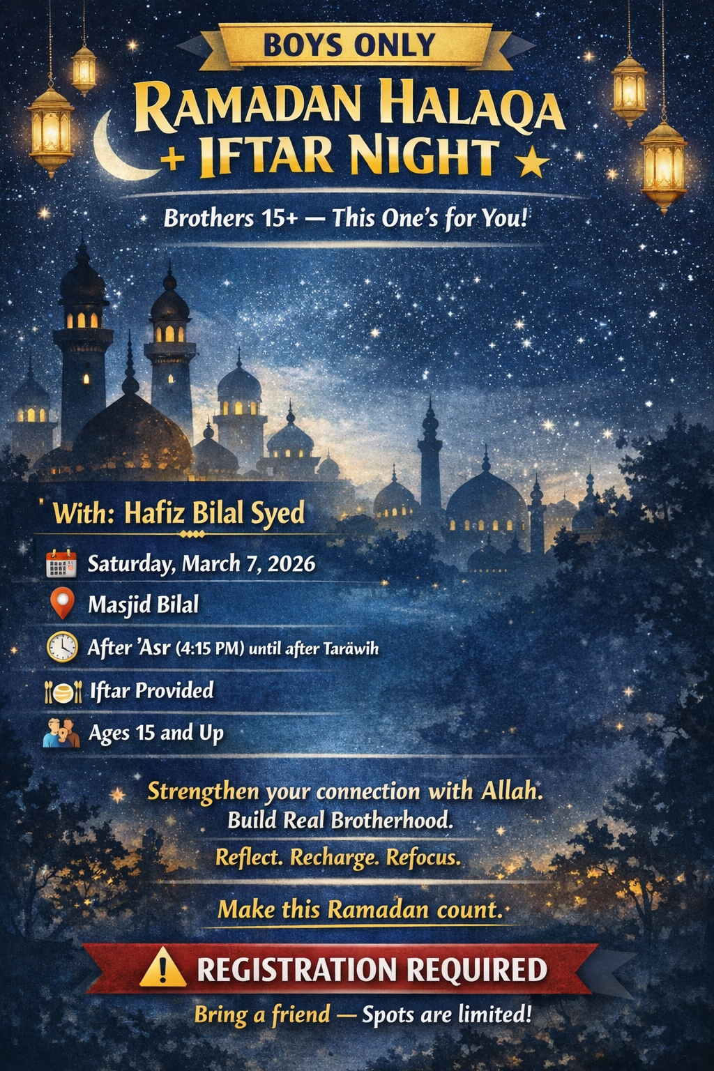 Join us for a powerful evening of īmān, brotherhood, reflection, and great food!