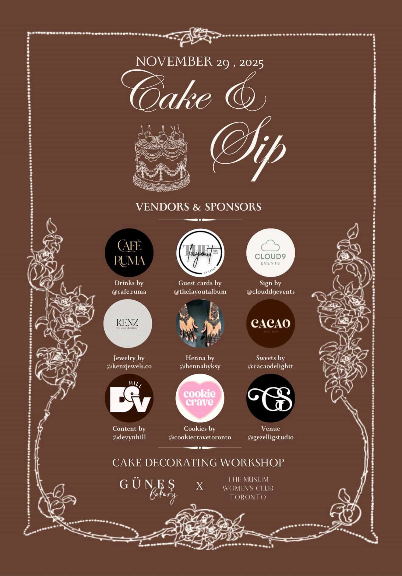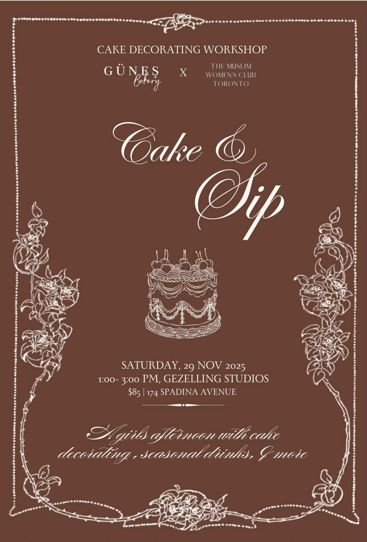 Join us for THE Fall event of the season! A Cake and Sip event for Muslim women, where you’ll get to decorate and take home your very own cake - with buttercream filling - and beautiful decor options! We’ll have a live coffee cart - Ruma Cafe (@cafe.ruma) - serving guests lattes and matchas so you can sip and decorate at same time! If you’re ready to get out of our comfort zone, sketch out some time for yourself to fill your cup, and make new friends, then join us! Details below: