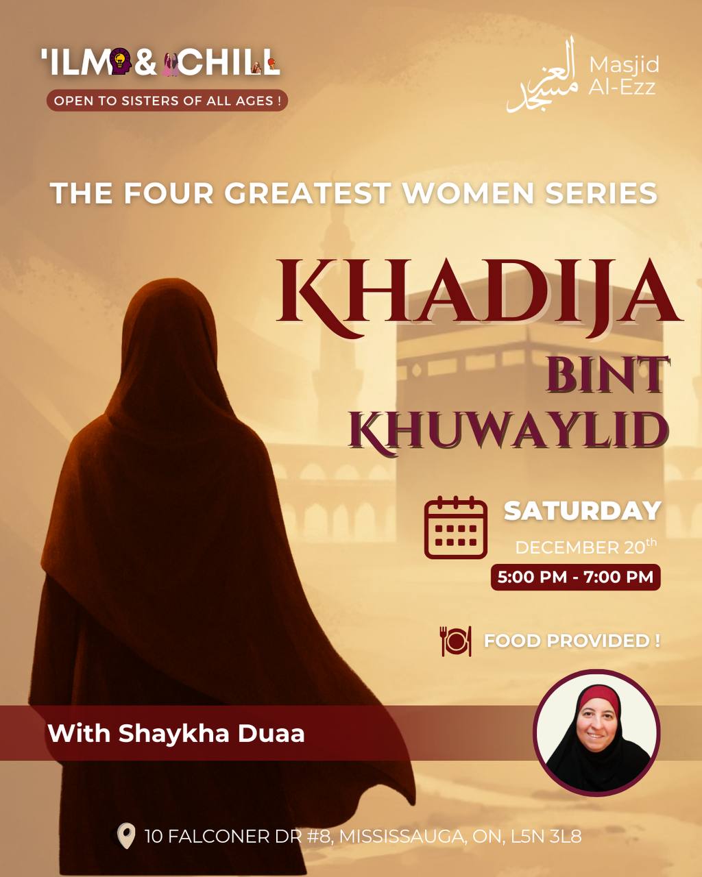 As we continue the Four Greatest Women series, this Saturday we explore the life of Khadijah (RA) — a woman whose legacy is rooted in wisdom, generosity, and strength.