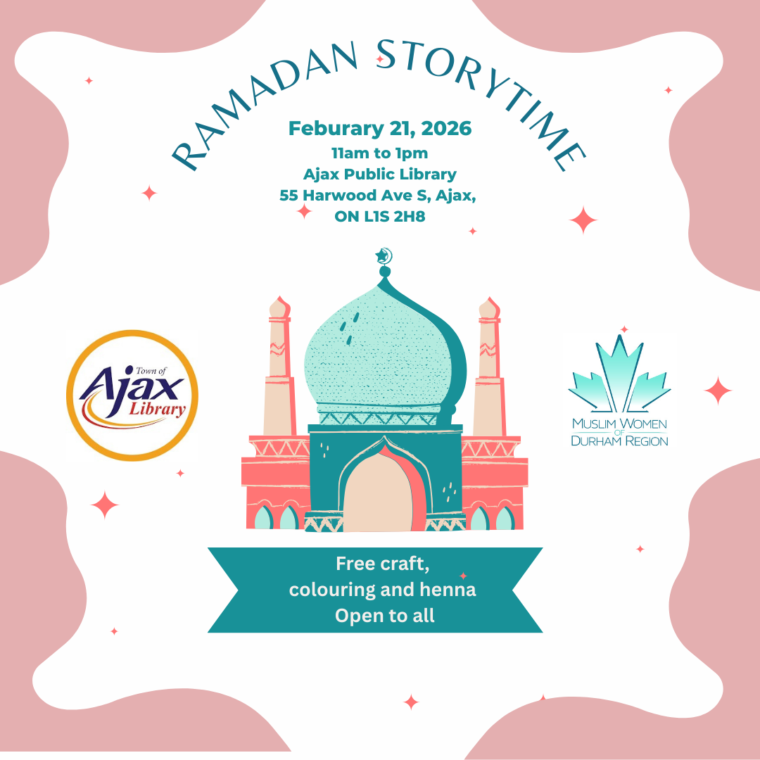 We are excited to invite you to a special community event hosted in partnership with Ajax Library and Muslim Women of Durham Region, a joyful celebration of Ramadan and Eid for families of all backgrounds.