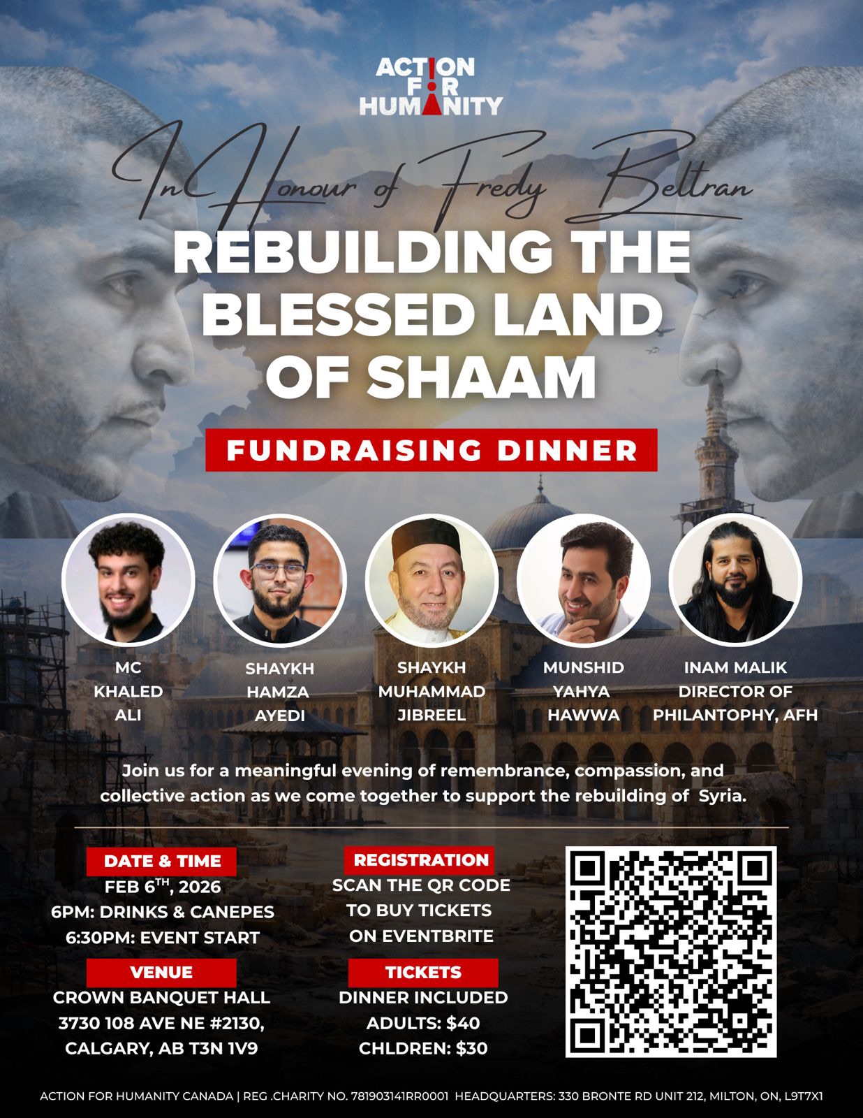 Your presence and support will help transform remembrance into lasting impact. Together, we can honour Fredy’s legacy and the legacy of our loved ones by rebuilding lives and restoring hope in the blessed land of Shaam.
