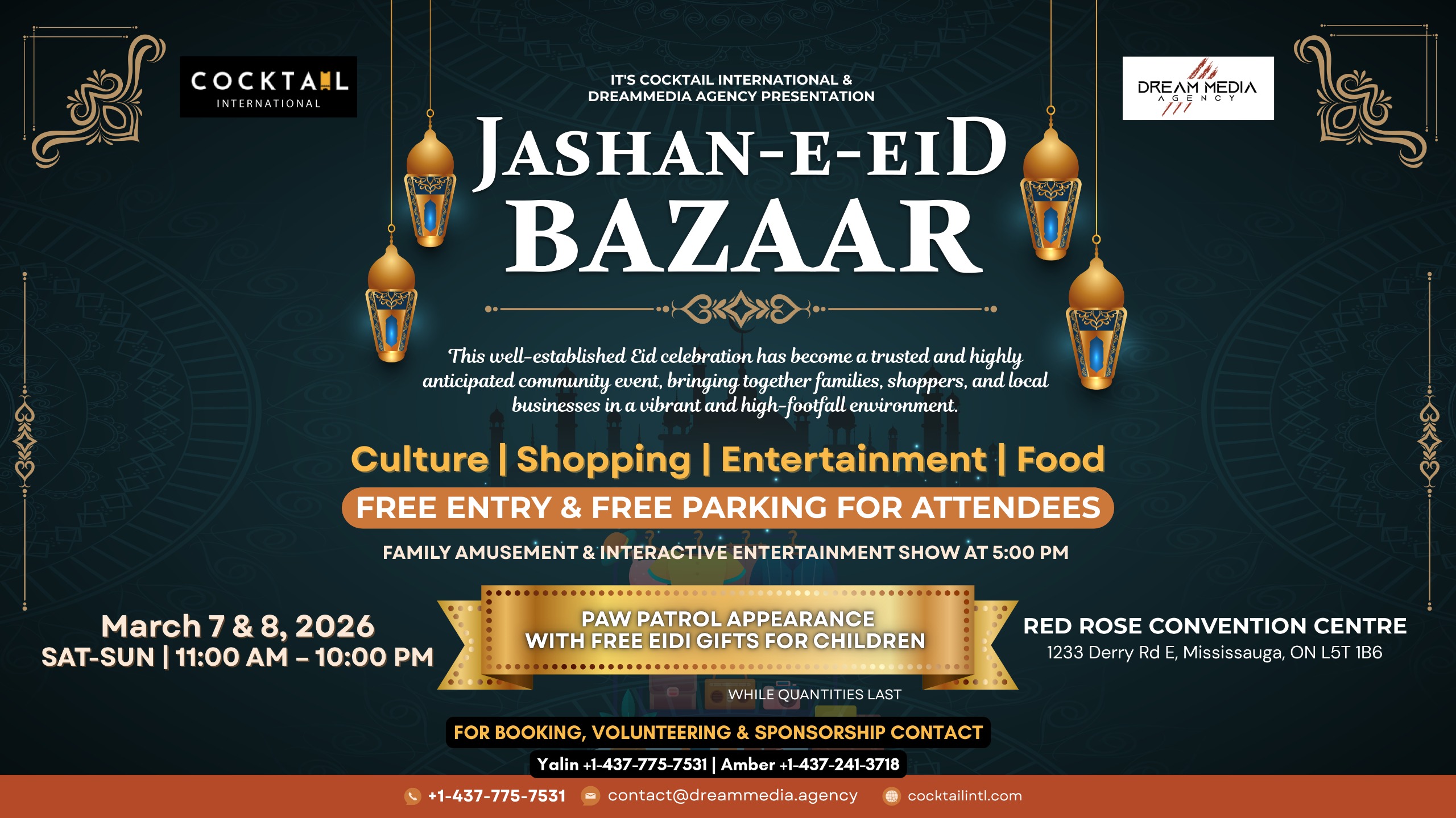 After five incredible years of bringing Eid joy to the community, Cocktail International & DreamMedia Agency proudly return with the most anticipated Jashan-e-Eid Bazaar at the magnificent Red Rose Convention Centre — a premium indoor venue built for a high-energy, family-friendly Eid experience.