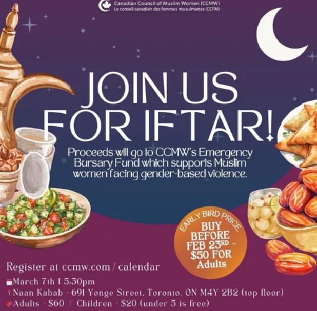 Held on the eve of International Women’s Day, this iftar reflects the 2026 theme “Give To Gain,” honouring the power of generosity and collective care. A portion of the proceeds will support the CCMW Emergency Bursary Fund, providing critical assistance to Muslim women in Canada facing gender-based violence—helping women and their families access safety, financial relief, and pathways to justice.