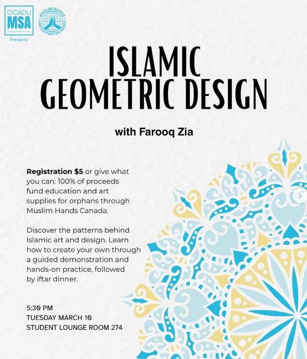 This workshop has a $5 Registration, or give what you can: 100% of proceeds fund education and art supplies for orphans through Muslim Hands Canada.