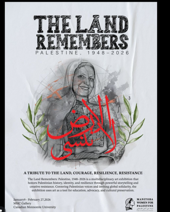 “The Land Remembers” exhibit is led by the new collective “Manitoba Women for Palestine” with support of collaborators. There are contributions from Palestinian and other local artists, activists, and educators.